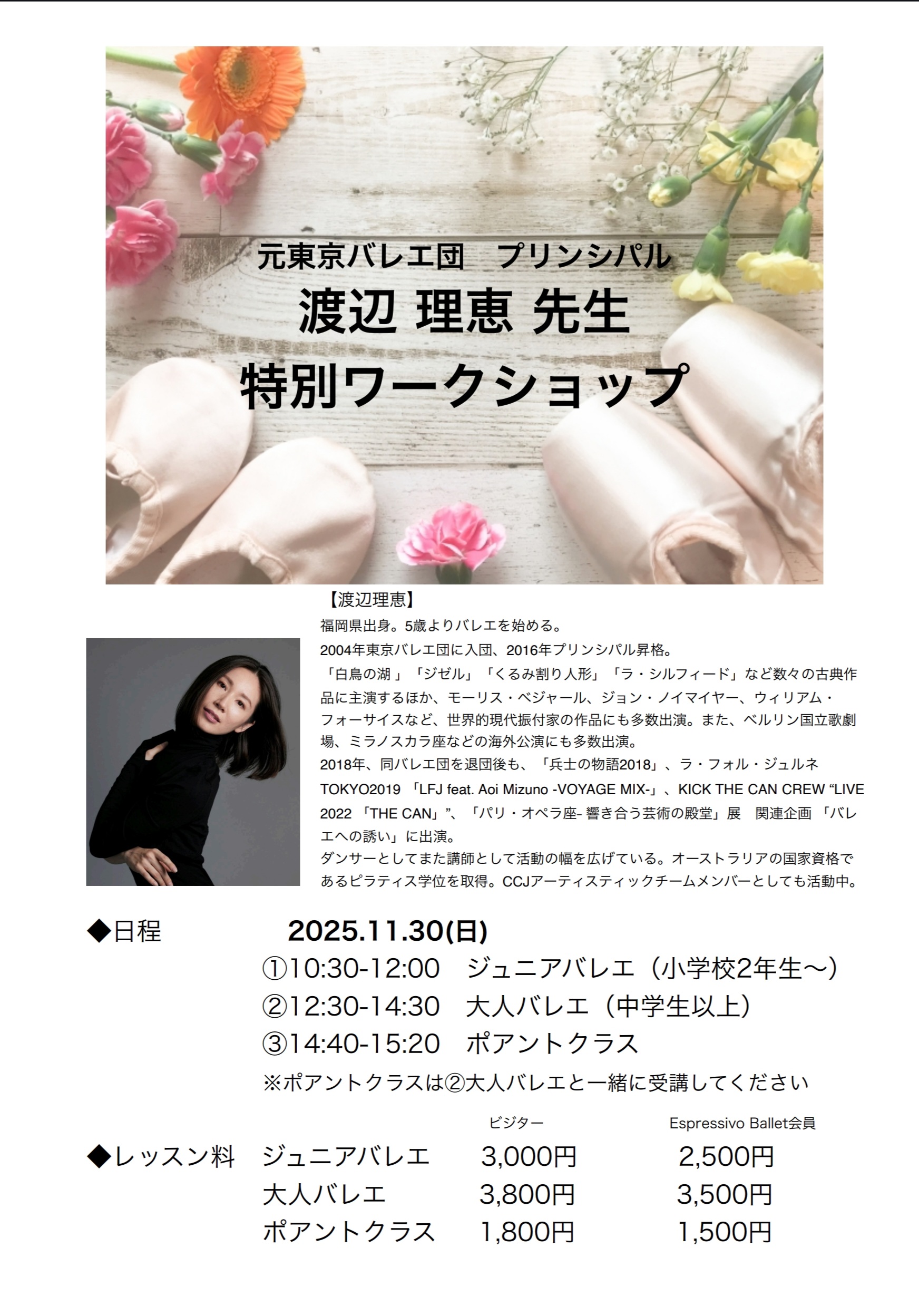 渡辺理恵先生による バレエ&ポワントクラスworkshopを開催致します。